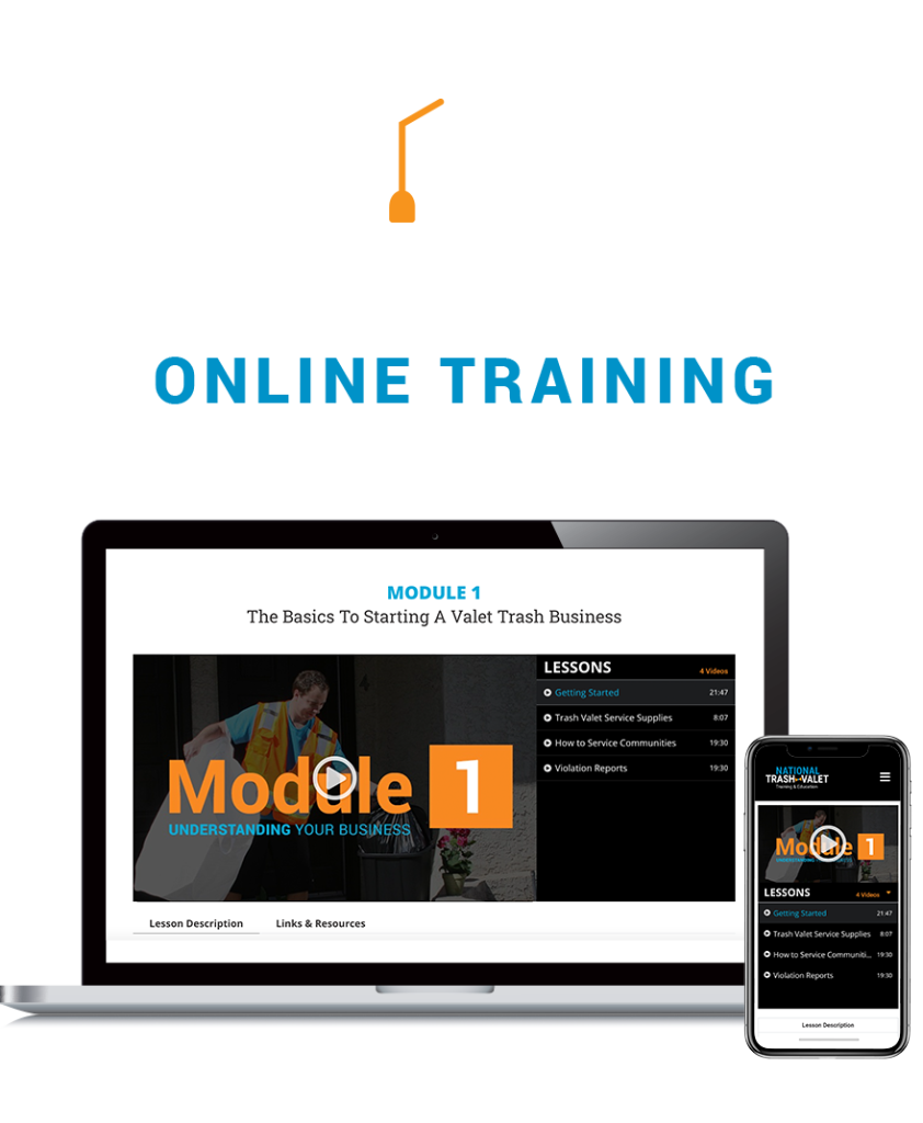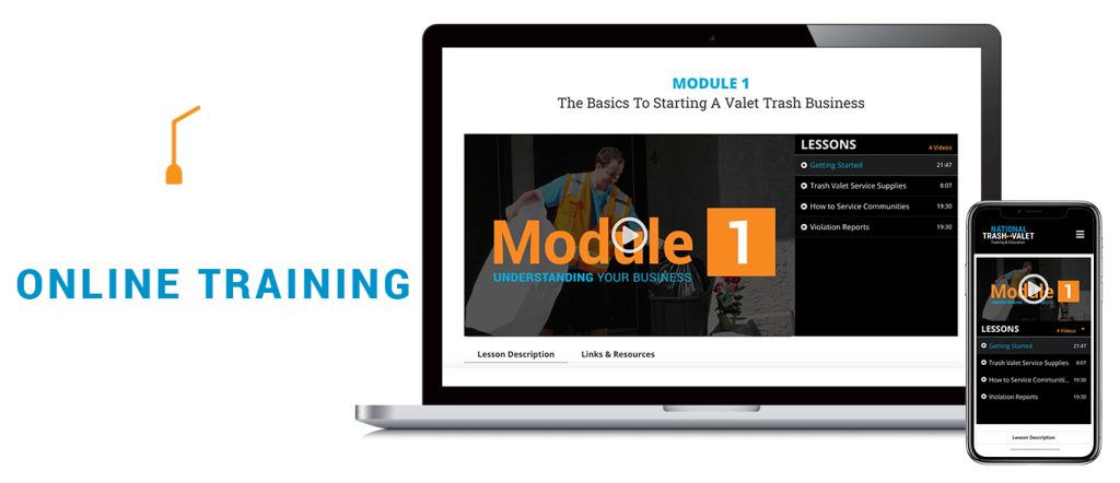 Learn how to start, run, manage, sell, and market a trash valet business through 30 step-by-step training videos.